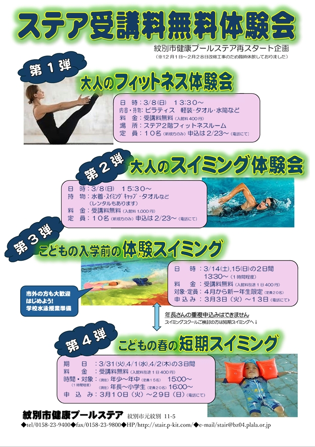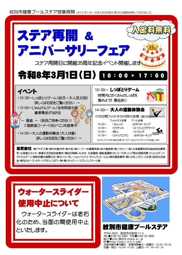紋別市健康プールステア営業再開致します!